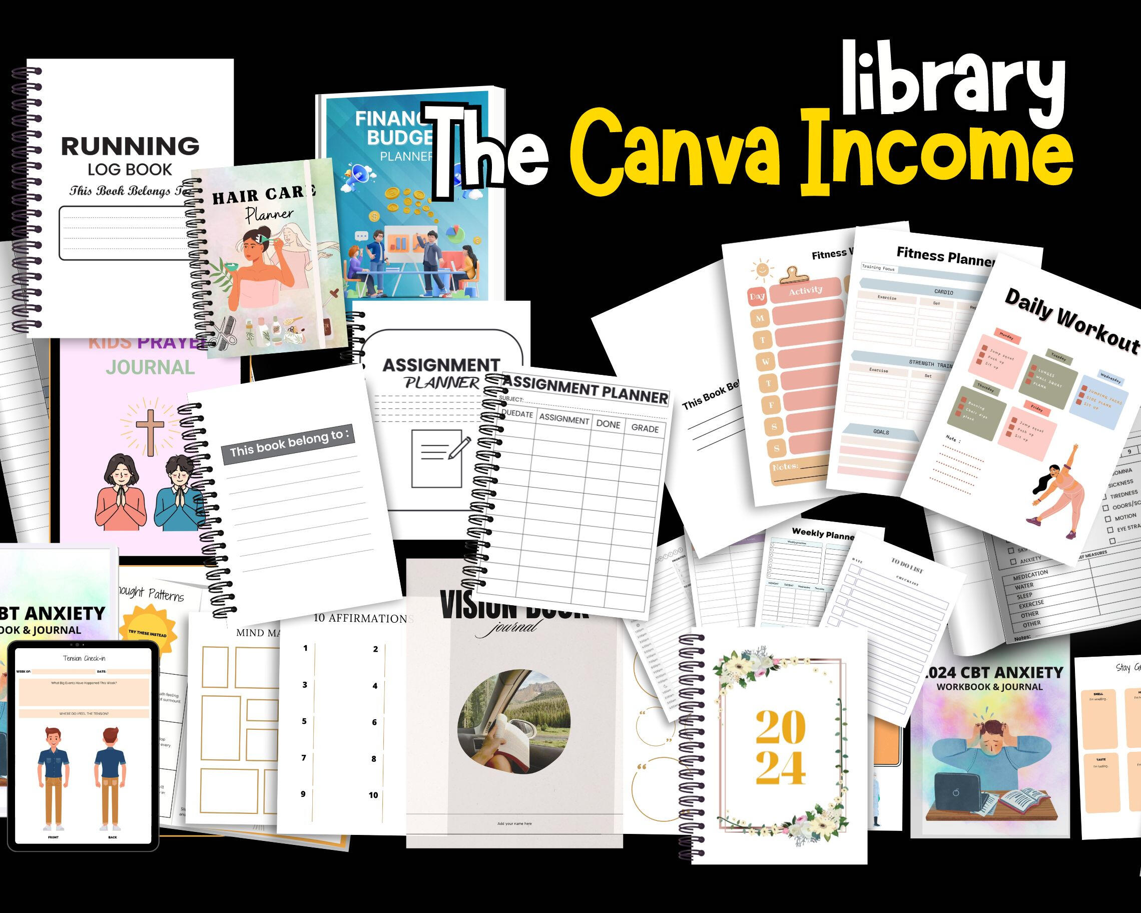 The full Canva Income library with over 10,000 readymade Canva digital products to help you make passive income